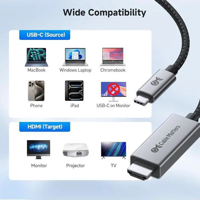 Upgrade to HDMI 2.1 or future-proof your setup with the Cable Matters USB C to HDMI 2.1 cable; HDMI to USB-C cord combines the latest HDMI 2.1 standard with the versatility of USB-C; The USB C to HDMI cord supports up to 8K 60Hz resolution on compatible displays and devices
