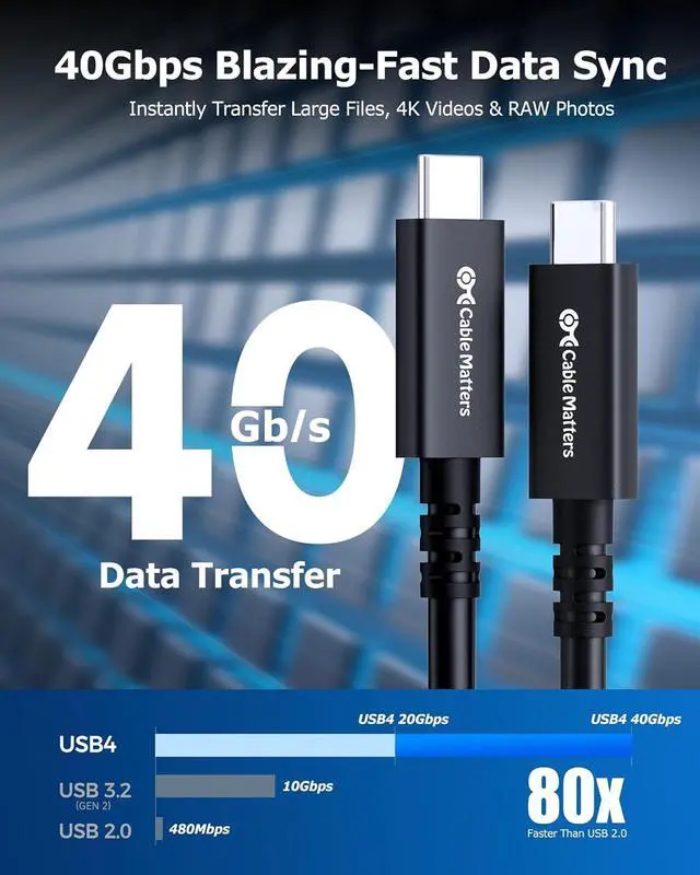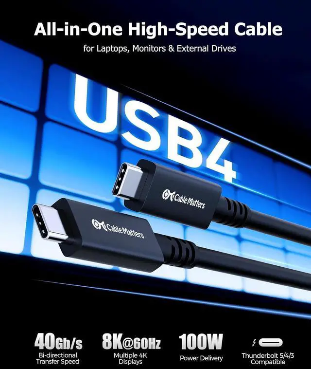 Step into the future of USB with the Cable Matters Active USB4 to USB4 Cable; Active USB Type C cable supports the latest USB4 standard for up to 40Gbps of bandwidth, 8K video support, and 100W charging