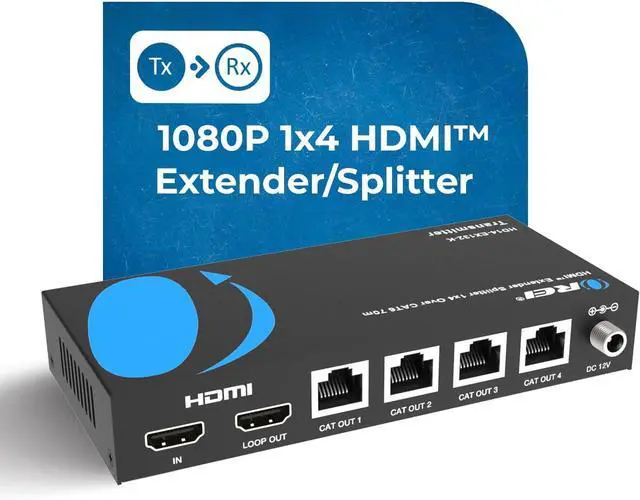HDMI Transmitter is equipped with 4 Port CAT6 Output. And 1 Additional HDMI Output to connect to a local display or monitor. The device comes with a dual voltage supply using a US plug, and an adapter/converter is provided for international use.