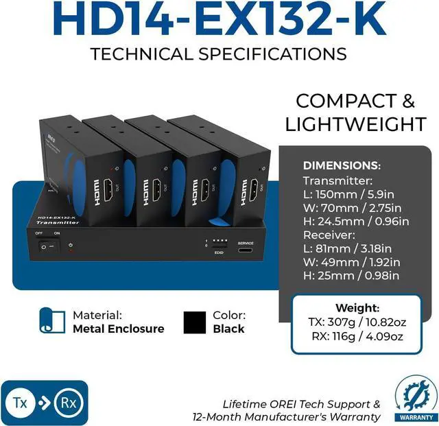 The OREI advantage: Includes 1 year warranty with lifetime OREI support, Package includes: 1x Transmitter, 1x Receiver, 2x 5V/1A Power Adapter, User manual.