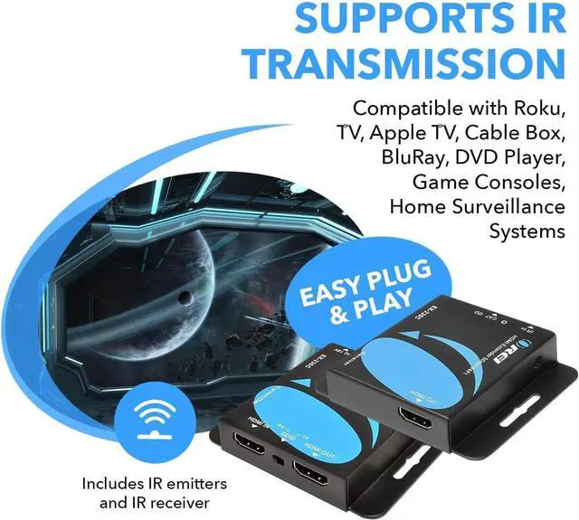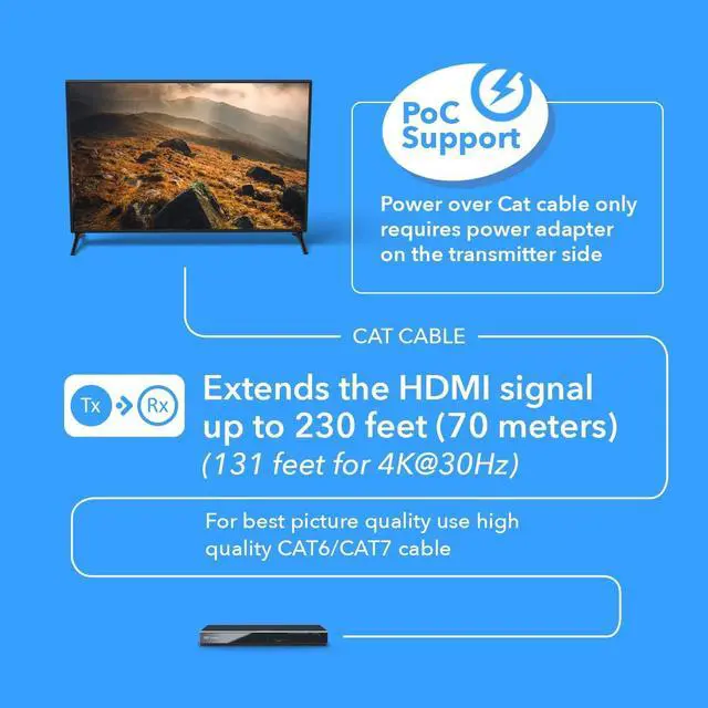 230 Feet HDMI Extender - It can transmit HDMI signal 4K @ 30Hz for up to 130 Feet and Full 1080P Signal upto 230 Feet with CAT6/7 LAN Cable. Recommended Shielded Cable for best signal quality. Perfect for home/office for PC, Game Consoles, Blu Ray Players/Media Players, Sky HD box, satellite box, Android box.