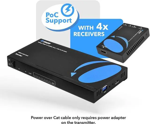 Distribute 4K HDMI Source to 4 Displays: Extend one HDMI source to 4 HDMI displays simultaneously over Cat6/7/8 network cable. Splitter includedno switcher needed. Power over LAN; no adapter required on the receiver side. The device also comes with a dual voltage supply using a US plug, and an adapter/converter is provided for international use.