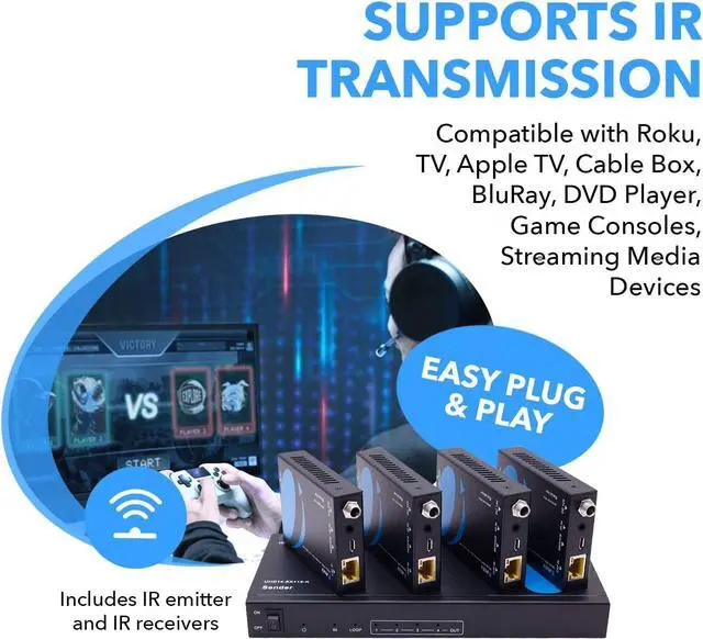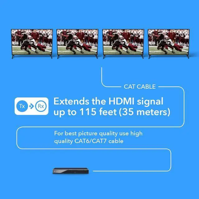Extended Range & HDR Support: Output 4K signal up to 115 feet and 1080p up to 165 feet. Supports HDR, HDR10, HDR10+, Dolby Vision, and HLG. Transmitter features 4-port CAT6 output plus 1 additional HDMI output for a local display or monitor.