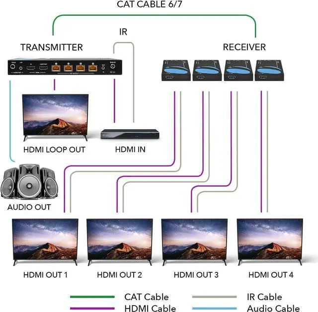IR & Loop-Out Control: Loop-out on the sender unit for local monitoring. Full IR remote control input supports 2060kHz IR pass-back to control a DVD player or other HDMI source remotely via dedicated DDC channel.
