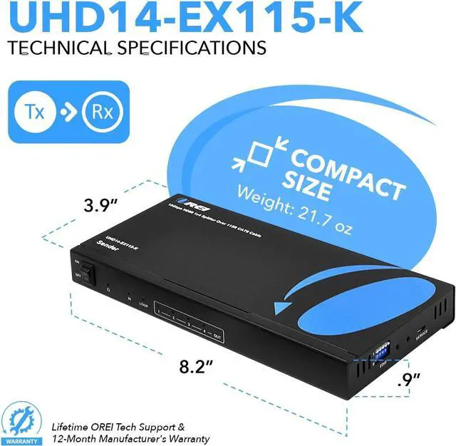 Package & Warranty: Includes 1 × transmitter, 4 × receivers, 1 × power adapter, 1 × IR blaster cable, 4 × IR receiver cables, and 1 × user manual. Only one power adapter is needed for the entire system. Backed by 1-year OREI manufacturers warranty.