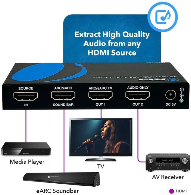 Audio Extractor: Extract full HDMI audio from any HDMI source signal and pass-through 4K or HDR the video to a compatible display/TV and output HDMI Audio to AV Receiver with HDMI input