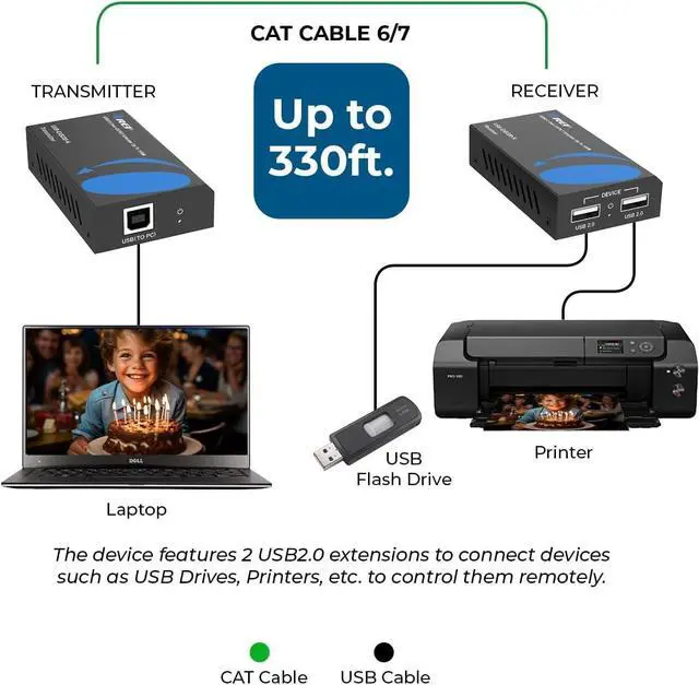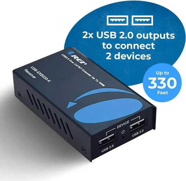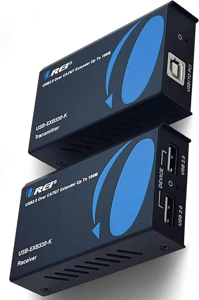 OREI USB 2.0 over Cat5e/6 Extender - Powered USB Range Balun supports upto 330 Feet High - Speed USB 2.0 Function (Max 480Mbps) - Supports Any Operating Systems such as ( Windows, MacOs, Android, Linux). The device comes with a dual voltage supply using a US plug, and an adapter/converter is provided for international use.