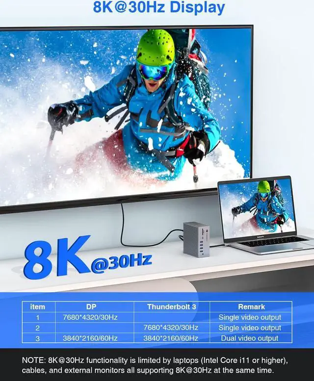 Single 8K or Dual 4K Extended DisplaysTOTU thunderbolt 3 dual monitor docking station supports up to dual 4K@60Hz via thunderbolt 3 port and DisplayPort. Single DisplayPort/thunderbolt 3 port supports up to 8K@30Hz. (*NOTE*: 8K@30Hz functionality is limited by laptops (Intel Core i11 or higher), DP cables, and external monitors supporting 8K@30Hz at the same time.)