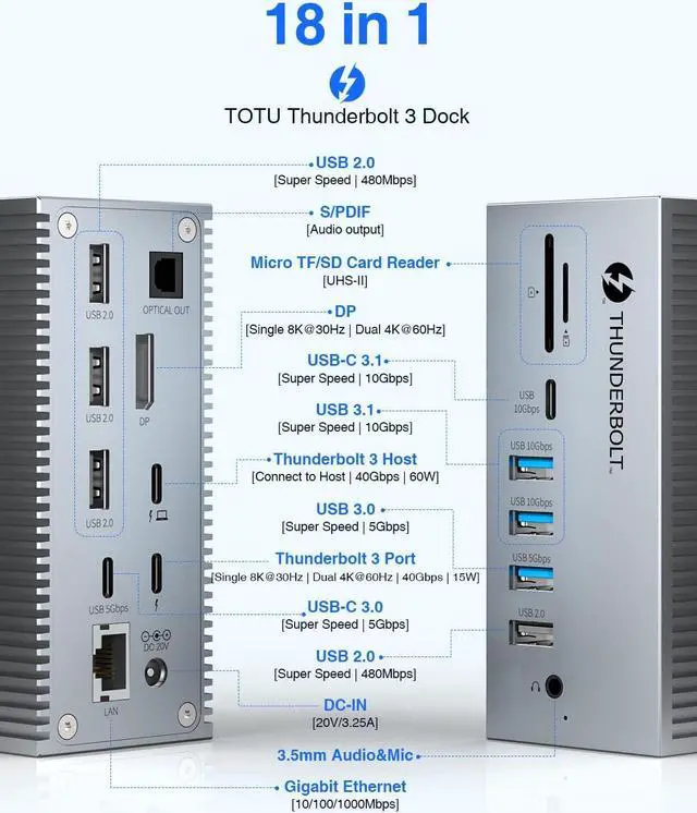 18 in 1 Thunderbolt 3 DockTOTU thunderbolt 3 Macbook Pro docking station is equipped with 2x thunderbolt 3 ports, 1x DisplayPort, 2x USB 3.1 (10Gbps), 1x USB 3.0 (5Gbps), 1x USB-C (10Gbps), 1x USB-C (5Gbps), 4x USB 2.0 (480Mbps), Gigabit Ethernet, SD/micro SD, 3.5mm Audio/Microphone and S/PDIF(Audio output). The package includes TOTU thunderbolt 3 docking station, 60W power adapter, a thunderbolt 3 cable (1.6 ft), user manual and our lifetime technical support.
