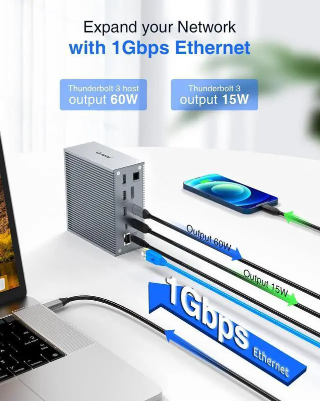 Expand your Network with Gigabit EthernetWith Gigabit Ethernet RJ-45 LAN port, TOTU thunderbolt 3 USB C docking station dual monitor for MacBook Pro provides you with fast wired network connection. TOTU thunderbolt 3 host port provides up to 60W to charge your laptop stably. The secondary thunderbolt 3 port provides 15W for downstream devices.