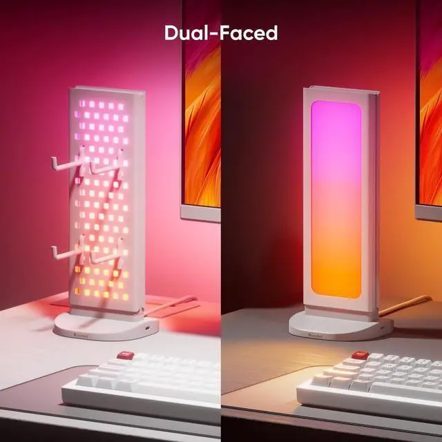 [Dual Faced Lighting] Use the light pegboard side to store & display accessories, or turn 180º for full-faced lighting effects. Simply click, lift & rotate!