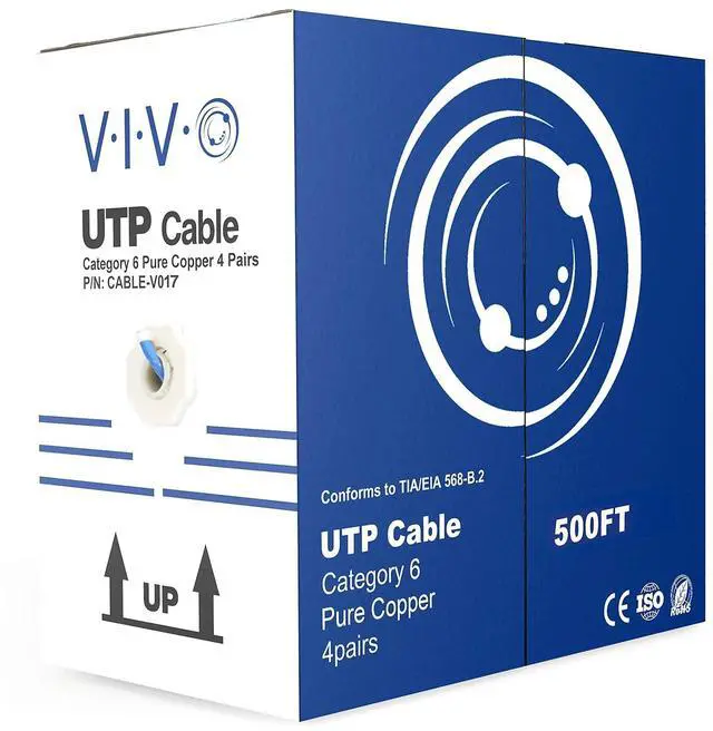 Cable Type: Cat6 bulk ethernet cable, 500 ft roll, connector free. Suitable for Fast, Gigabit, and 10-Gigabit Ethernet