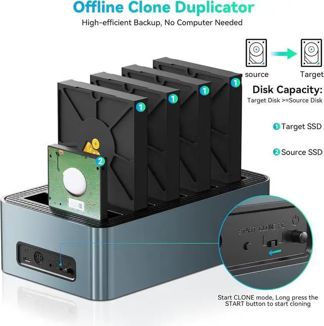 1:4 Offline CloningYottamaster 5-bay hard drive duplicator supports offline cloning without a PC connection. This hard drive cloner can simultaneously clone up to four hard drives; the source drive is cloned onto four target drives with the press of a CLONE button. This HDD docking station also acts as a 5bay external enclosure for instant access to drive content and data transfer across up to 5 hard drives at once.