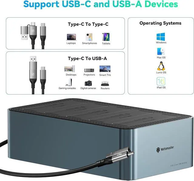 Wide Compatibility5-bay external hard drive dock is compatible with Windows and Mac OS. It features tool-free installation, plug-and-play functionality. Connect to USB devices such as PC, TV, routers, or game consoles.