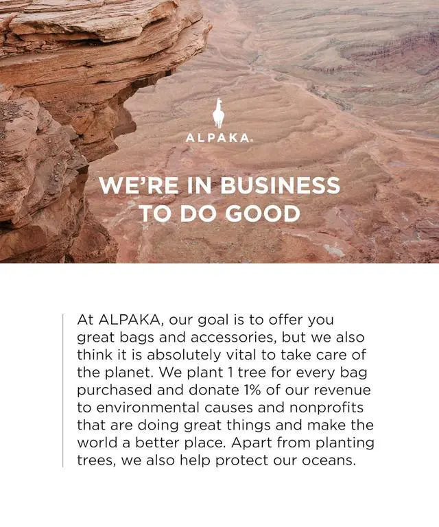 Our Promise - At ALPAKA we make high quality accessories, bags, and key chains while taking care of the planet. We donate 1% of profits to environmental nonprofits and plant 1 tree for every purchase.