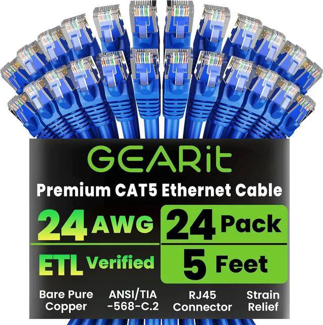 GearIT 24-Pack, Cat5e Ethernet Patch Cable 5 Feet - Snagless RJ45 Computer LAN Network Cord, Blue - Compatible with 24 48 Port Switch POE Rackmount 24port Gigabit