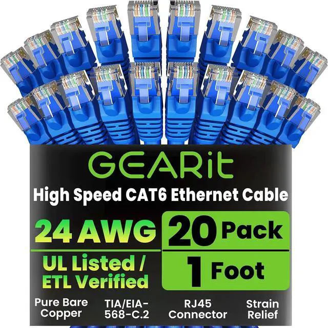 GearIT 20 Pack, Cat 6 Ethernet Cable Cat6 Snagless Patch 1 Foot - Computer LAN Network Cord, Blue