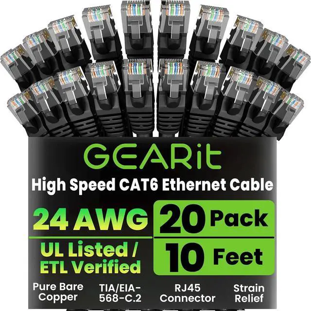 GearIT 20 Pack, Cat 6 Ethernet Cable Cat6 Snagless Patch 10 Feet - Computer LAN Network Cord, Black