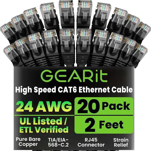 future-proof your network for 10-Gigabit Ethernet with GearIT Cat 6 network patch cables. With GearIT Cat6 cables, your network will be ready for the future and will still be working when you get there. industry standard ANSI/TIA-568-C.2, Cat 6, etc. Verified cables with High compliance RJ45 (8P8C) snag-less connectors and molded strain relief boots. Bandwidth rating of up to 550 MHz ensures compatibility with Ethernet 10BASE-T, 100base-tx(fast Ethernet), 1000base-t (Gigabit Ethernet), 10GBase-T (10-Gigabit Ethernet), peer-to-peer, and any other applications that utilize networking cables including telephony, home automation and long distance video transfer technologies like HMDI over Ethernet. Use to connect any network able device with RJ45 connection including PC's, laptops, servers, printers, NAS storage devices, VoIP, power over Ethernet (PoE), DVR's, etc. utp - Unshielded Twisted pairs -the effectiveness of UTP cable design which uses Twisted pairs without the need for additional shielding have allowed this Type of cabling to be the most cost effective solution available for any Type of advanced local area network connection and made it an industry standard for a wide variety of applications. specifications cable Type: Cat6, utp conductor material(more...)