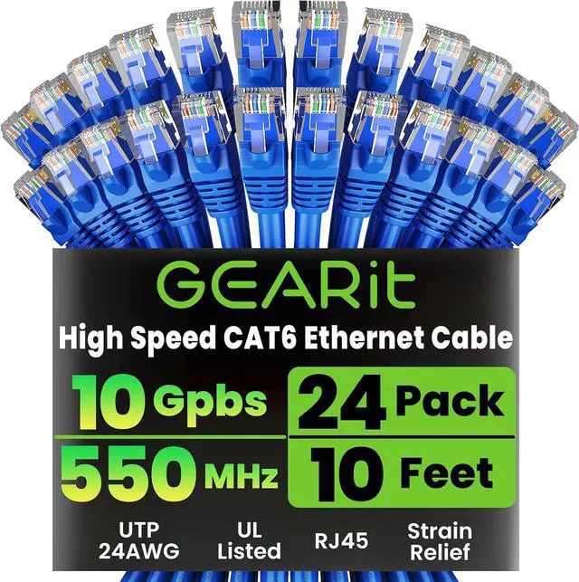 High-Performance Cat 6 Ethernet Cable Pack GEARit's 24-pack of 10 ft Cat6 ethernet patch cables features 24 AWG UTP stranded conductors twisted in an X-structure spline to minimize crosstalk and deliver full 10 Gbps bandwidth - future-proof network cables for home, office, data-center, and server use.