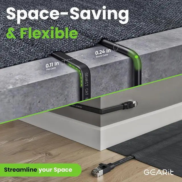 Space-Saving & Flexible - Our FLAT RJ45 cable is tailored for high-density environments, offering the flexibility and space-saving benefits of a flat cord design. Perfect for discreet installations, it effortlessly runs along walls, edges, corners, and underneath rugs or carpets for seamless concealment. Say goodbye to kinks and tangled cords with this versatile solution.