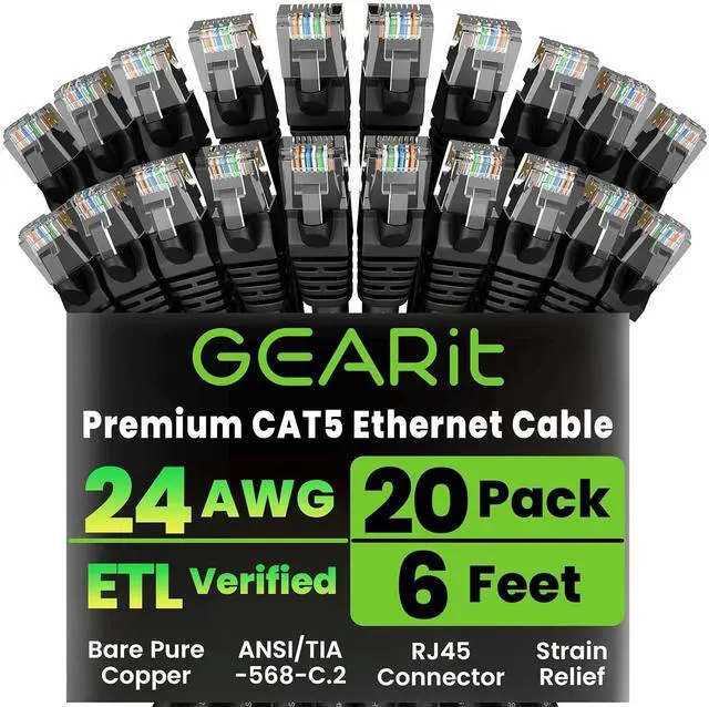 GearIt 20-Pack, Cat5e Ethernet Patch Cable 6 Feet - Snagless RJ45 Computer LAN Network Cord, Black