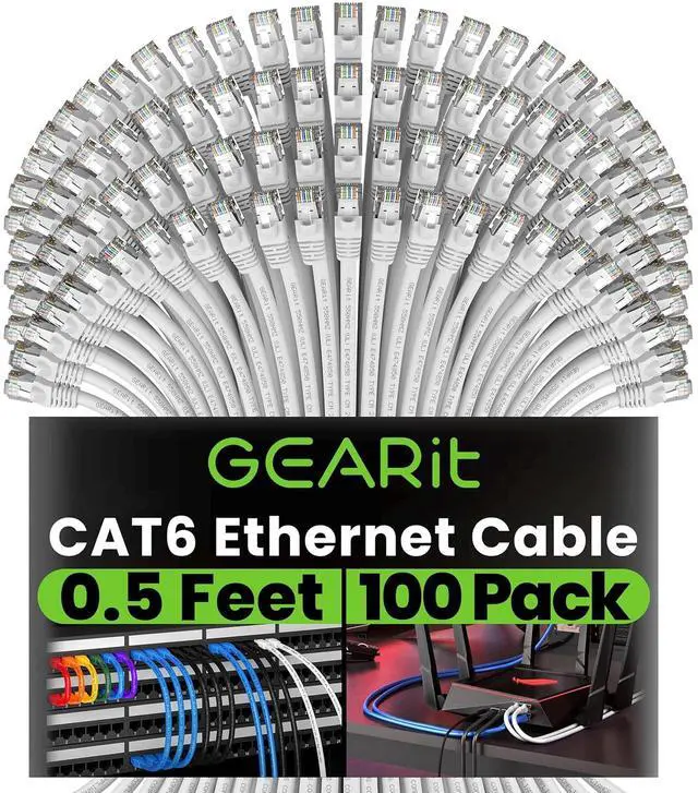 GearIT 100-Pack, Cat 6 Ethernet Cable Cat6 Snagless Patch 0.5 Feet - Snagless RJ45 Computer LAN Network Cord, White - Compatible with 48 Port Switch POE Rackmount 48port Gigabit
