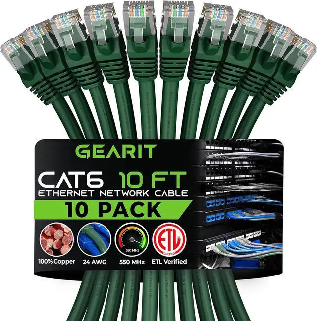 GearIT 10 Pack, Cat 6 Ethernet Cable Cat6 Snagless Patch 10 Feet - Computer LAN Network Cord, Green - Compatible with 10 Port Switch POE 10port Gigabit