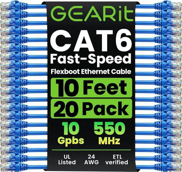 GearIT 20-Pack Cat6 Patch Cable 10 Feet Cat 6 Ethernet Cable Snagless Flexible Soft Tab - Preimum Series - Blue