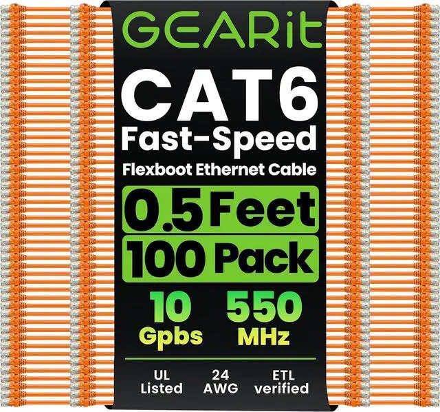 GearIT 100-Pack Cat6 Patch Cable 0.5 Foot / 6 Inches Cat 6 Ethernet Cable Snagless Flexible Soft Tab - Preimum Series - Orange