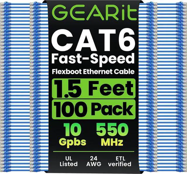 GearIT 100-Pack Cat6 Patch Cable 1.5 Feet / 18 Inches Cat 6 Ethernet Cable Snagless Flexible Soft Tab - Preimum Series - Blue
