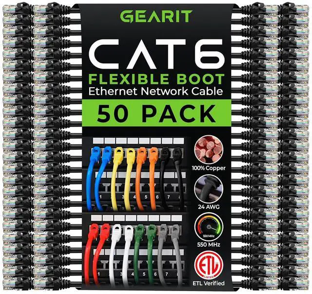 Future-proof your network for 10-Gigabit Ethernet with GEARit Cat 6 Network Patch Cables. With GEARit Cat6 cables, your network will be ready for the future and will still be working when you get there.Industry standard ANSI/TIA-568-C.2, Cat 6, ETL verified cables with high compliance RJ45 (8P8C) snag-less connectors and molded strain relief boots. Bandwidth rating of up to 550 Mhz ensures compatibility with Ethernet 10BASE-T, 100BASE-TX(Fast Ethernet), 1000BASE-T (Gigabit Ethernet), 10GBASE-T (10-Gigabit Ethernet), Peer-to-Peer, and any other applications that utilize networking cables including telephony, home automation and long distance video transfer technologies like HMDI over Ethernet. Use to connect any networkable device with RJ45 connection including PC's, laptops, servers, printers, NAS storage devices, VOIP, Power