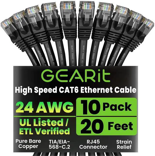 GearIT 10 Pack, Cat 6 Ethernet Cable Cat6 Snagless Patch 20 Feet - Computer LAN Network Cord, Black - Compatible with 10 Port Switch POE 10port Gigabit