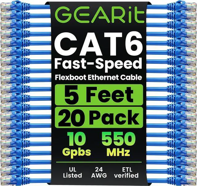 GearIT 20-Pack Cat6 Patch Cable 5 Feet Cat 6 Ethernet Cable Snagless Flexible Soft Tab - Preimum Series - Blue