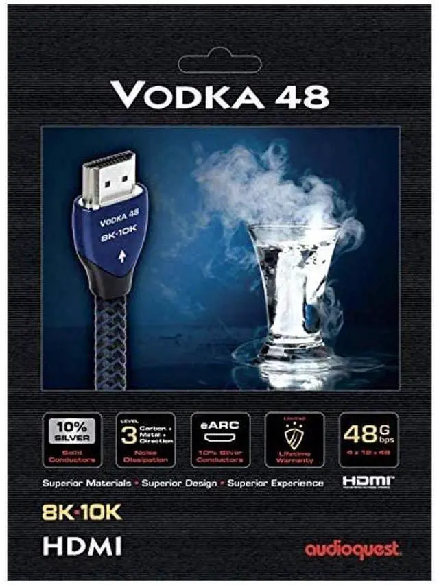 AudioQuest Vodka 48 HDMI cables can transfer up to professional 10K Ultra HD video. The incredible 48Gbps data rate is made possible by four balanced audio/video pairs each capable of 12Gbps, enabling a surprisingly stronger audio/video experience.