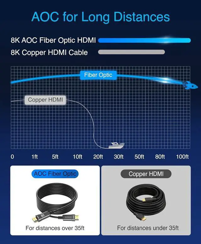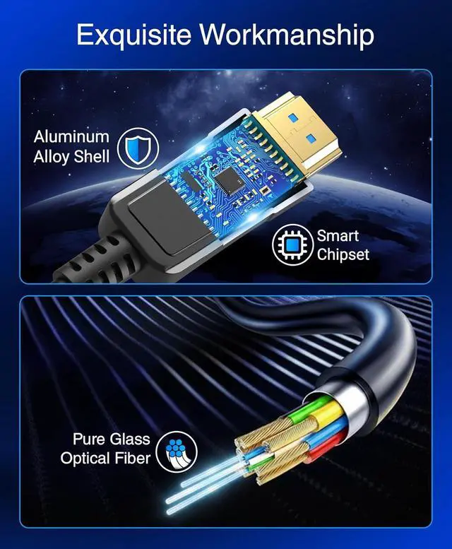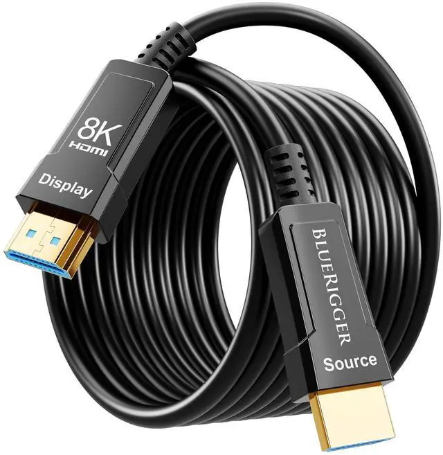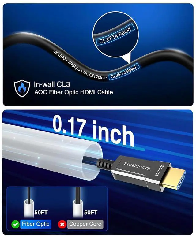 EXCELLENT CONSTRUCTION : Long HDMI 2.1 AOC cable with 24K Gold-Plated connectors and Zinc Alloy shell. The cord contains four strands of Optical Fiber Glass inside an insulated casing. Designed for long-distances while maintaining high data transfer speed. CL3 Rated for in-wall installations