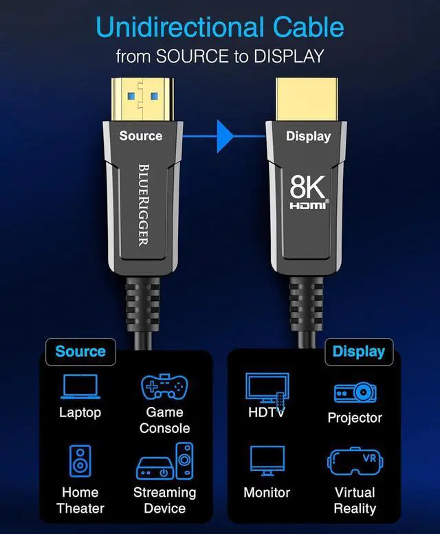 UNIVERSAL COMPATIBILITY: Compatible with PS5, PS4 Pro, Nintendo Switch, Xbox one X/S, Laptop, PC, Home theater, Blu-ray, VR, HDTV, TV Box, Apple TV, Projector, Monitor. Note: This cable is a Unidirectional Cable and connectors at each end are marked as SOURCE/DISPLAY. Please plug in each end accordingly
