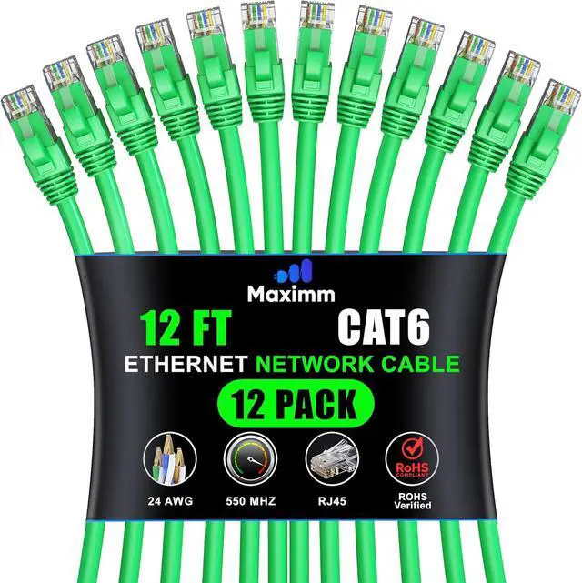 Maximm Cat 6 Ethernet Cable 12 ft (12-Pack) - High-Speed LAN Cable, Internet Cable, Patch Cable, and Network Cable - UTP, 10Gbps, 550MHz Ethernet Cord - Green
