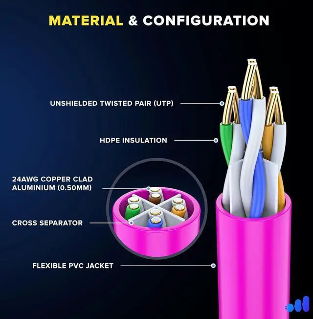 • UTP (Unshielded Twisted Pair) 4 pairs strand with separator for reduced crosstalk, molded snagless rubber boot and strain relief