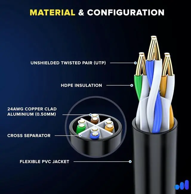 • UTP (Unshielded Twisted Pair) 4 pairs strand with separator for reduced crosstalk, molded snagless rubber boot and strain relief