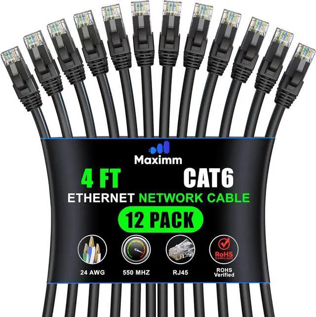 Maximm Cat 6 Ethernet Cable 4 Ft, (12-Pack) Cat6 Cable, LAN Cable, Internet Cable, Patch Cable and Network Cable - UTP (Black) 4 Feet ethernet Cord