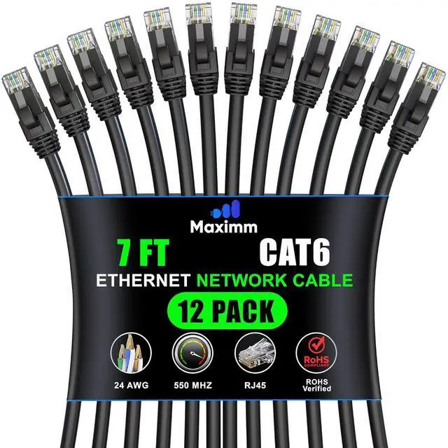 Maximm Cat 6 Ethernet Cable - 7 ft (12-Pack), High-Speed LAN, Internet, Patch, and Network Cable - UTP, 10Gbps, 550MHz Ethernet Cord - Black