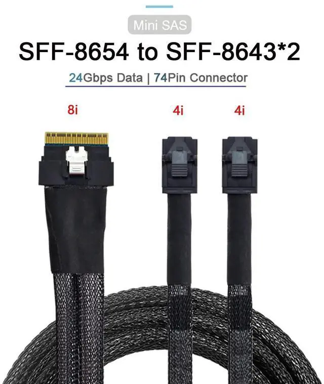 This cable can be used to connect internal devices, e.g. a backplane with Slim Line 8654 74pin connector to a controller with SFF-8643 connector.