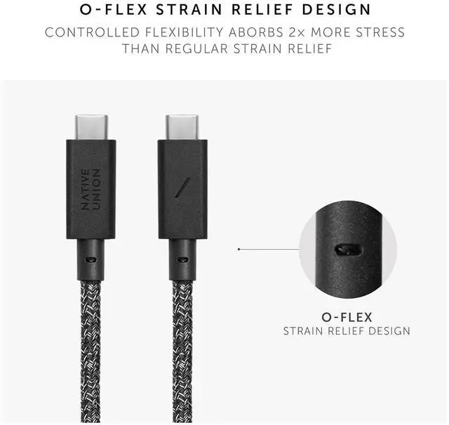 UNPARALLELED STRENGTH: Highly resistant cable with 100% recylced PET reinforced braiding and an ultra-strong aramid fiber core for an unmatched 30,000+ bend* lifespan. O-Flex strain relief design at connector joint absorbs 2x more stress than regular strain relief.