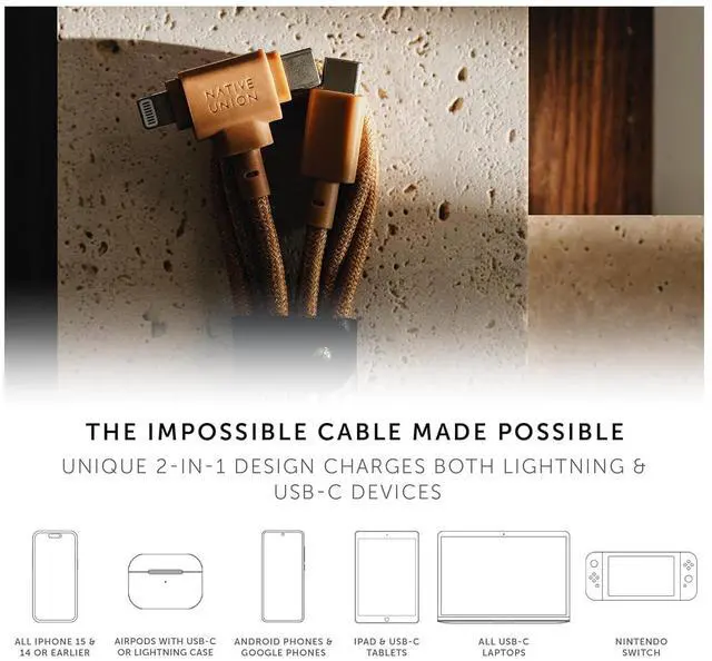 ALL-IN-ONE: The only charging cable youll ever need. Unique 2-in-1 dual connector head design charges all Lightning and Type-C devices with one single cable, with a patented metal pin to seamlessly switch between connectors. Wide compatibility including iPhone, Smartphones, AirPods, MacBook, iPad, Galaxy, Pixel, Kindle, drones, etc.