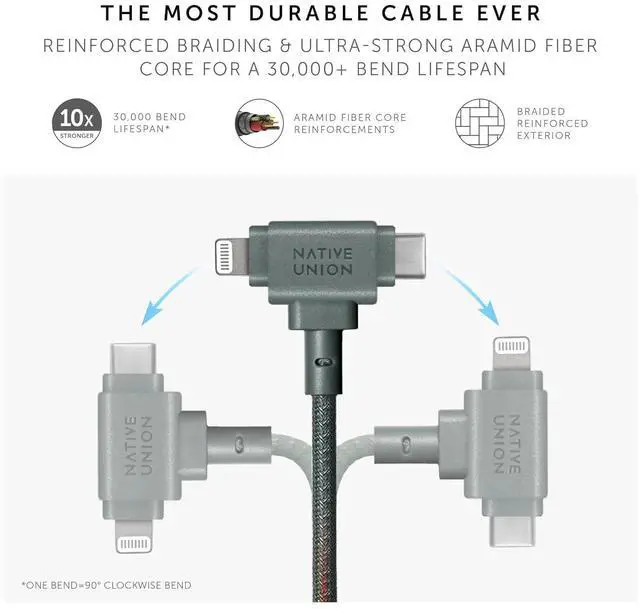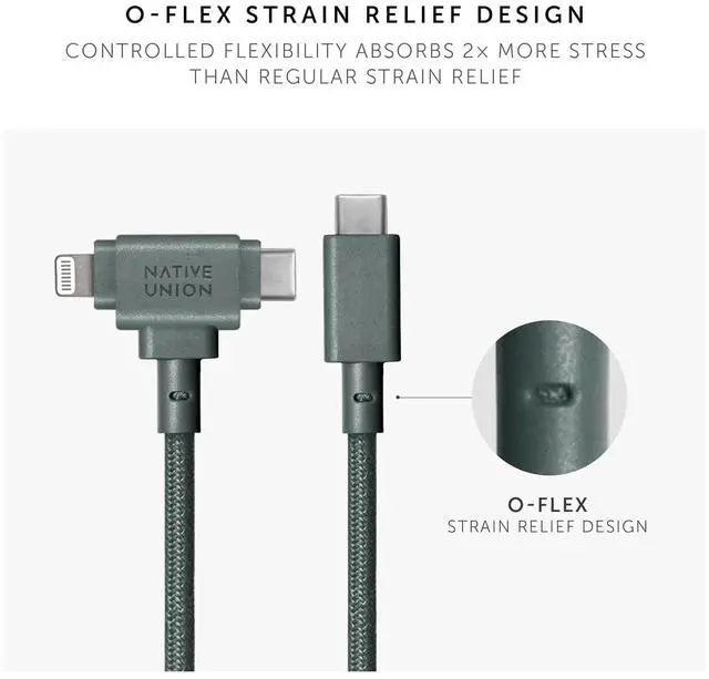 ULTRA-STRONG: The most durable cable ever with reinforced 100% recycled PET braiding and an ultra-strong aramid fiber core for unparalleled 15,000+ bend* lifespan. O-Flex strain relief design at connector joint absorbs 2x more stress than regular strain relief.