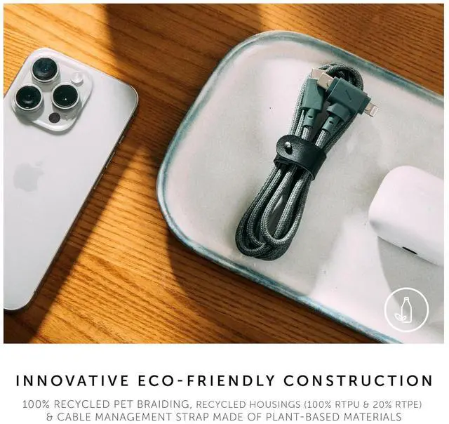 ECO-FRIENDLY: Made better for the Earth with an innovative eco-friendly construction: 100% recycled PET braiding, recycled housings (100% rTPU & 20% rTPE) & 75% recycled bonded leather strap.
