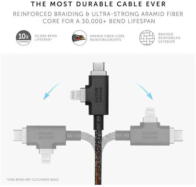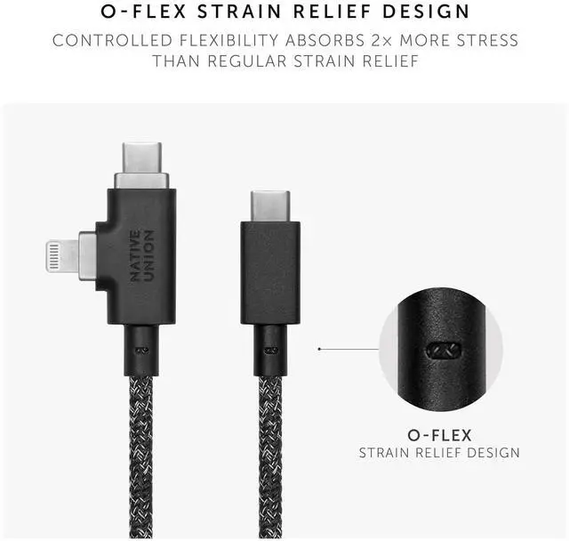 UNPARALLELED STRENGTH: Highly resistant cable with 100% recylced PET reinforced braiding and an ultra-strong aramid fiber core for an unmatched 30,000+ bend* lifespan. O-Flex strain relief design at connector joint absorbs 2x more stress than regular strain relief.