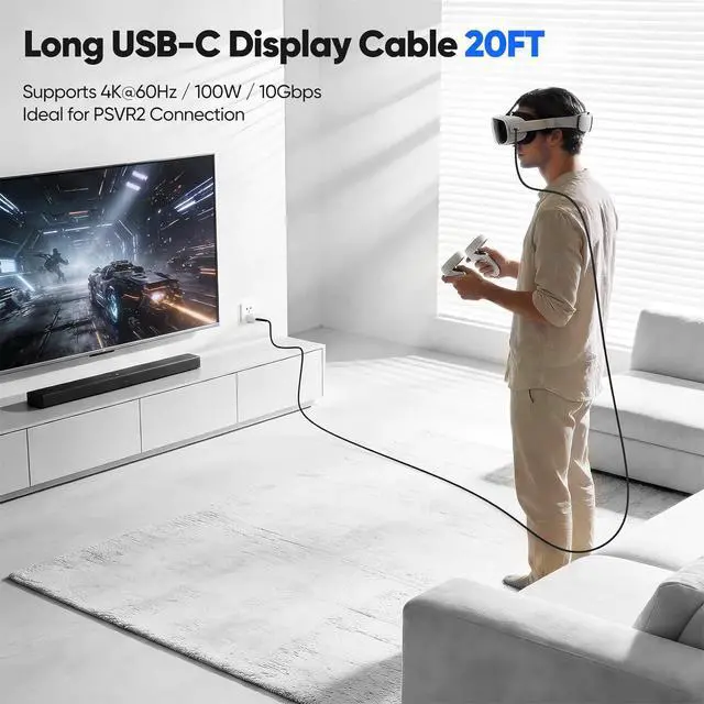PERFECT LENGTH FOR VR GAMING & COUCH/BED USEThe 20FT reach is ideal for connecting VR headsets so you can move freely and fully enjoy your games, and it also solves everyday problems like charging and using your phone or tablet comfortably from the couch, bed or across the room without being tethered to the outlet.