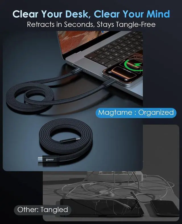 Magnetic Coiled USB C Video Cable: The Magtame Flat magnetic USB C to USB C cable coils into a compact 4-inch loop, keeping your desk, car, or travel bag neat and organized no tangles, no clutter.